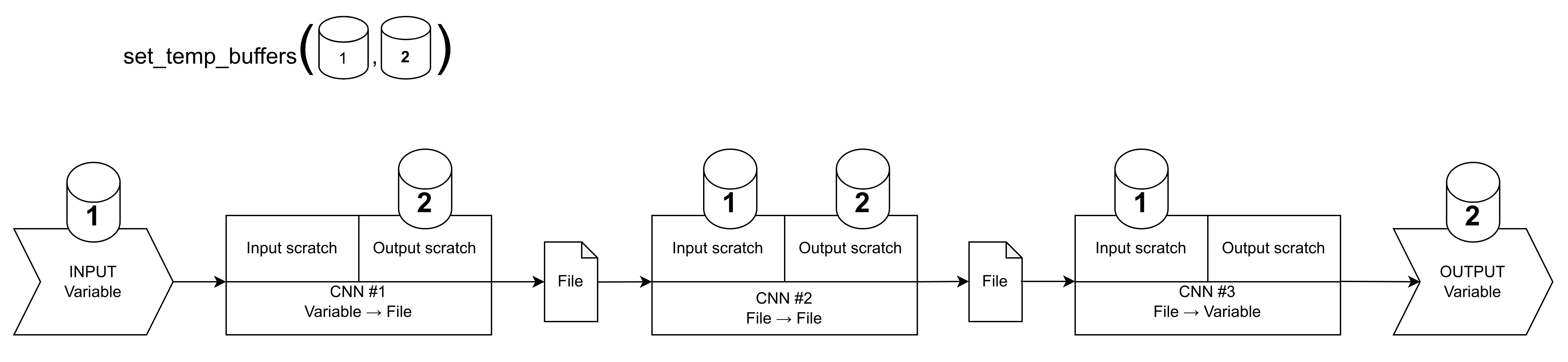 In the implementation, two large buffers are used (BUFFER3 and BUFFER4) with alternating roles (input and output). This is known as ping-pong buffering.